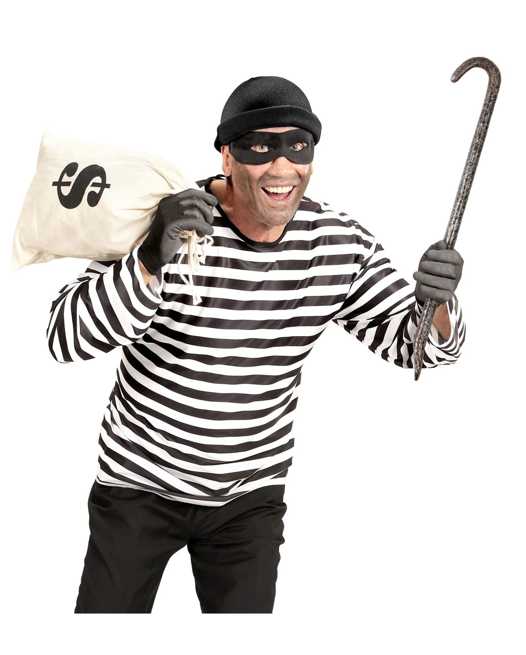 Unser 3-tlg. Dieb Kostüm besteht aus einem schwarz-weiß gestreiften Kostümshirt, einer schwarzen Augenmaske & einer schwarzen Kappe. Zusammen mit unserer Killer Brechstange, unserem Bankräuber Geld Sack aus Leinen und Schwarze Stoff Handschuhe wirst du zum üblen Verbrecher an Karneval.