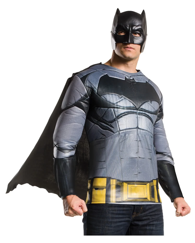 Das im neuen „Batman v Superman: Dawn Of Justice“-Film vorgestellte Batman Kostüm kannst du jetzt auch an Halloween, Karneval und auf der nächsten Comic Convention tragen. Hole dir einfach das fantastische Batman Muskel Kostüm-Shirt mit Maske & Cape, und verkleide dich als Gotham Citys größter Schurkenschreck.