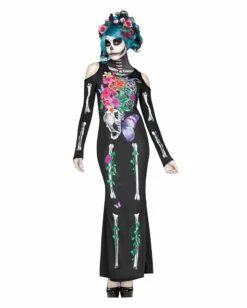 Mit dem Beautiful Bones Gerippe Kostümkleid hast du das ideale Damen Kostüm für Halloween und den Day of the Dead. Als schöne Untote bist du aus deinem Grab auferstanden, um die Vampire und Zombies um den Finger zu wickeln. Ein Blick auf deinen untoten Körper und es ist um jeden von ihnen geschehen. Deine anmutig verzierten Knochen sind einfach unwiderstehlich. Glamourös aufgepimpt, mit Blumenranken verziert. So wird man sich danach verzehren, dein wunderschönes Knochengerippe zum Tanz aufzufordern.
