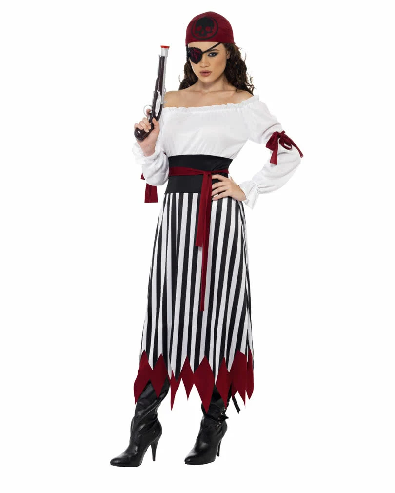 Das schwarz-weiße Piratinnenkleid besitzt als Einteiler lange Ärmel und einen tiefen Ausschnitt, der mit Gummibund als Rüsche verziert ist. Das gestreifte Enden des Kleids sind am Knöchel mit roten Zacken abgesetzt und wird durch den schwarzen Stoff an der Taille zur Bluse hin raffiniert unterteilt. Der angenähte rote Gürtel sowie dazugehörige Armbänder sind das perfekte Kostümaccessoire und verleihen verspielte Rafinesse. Den Abschluss des Buccaneer Piratin Kostüms bildet das Kopftuch mit Totenkopfsymbol.