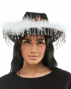 Der Cowboyhut mit Fransen und Federn Schwarz begeistert durch sein ausgefallenes Design. Dazu wurde der schwarze Kostüm Hut mit Fransen, weißen flauschigen Kunstfedern und einer Vielzahl an feinen Schmucksteinen, die an den Fransen baumeln, versehen. Hinter den Federn erkennen wir ein rotes Flammenmuster, das auf dem Faschingshut das letzte fantastische Detail darstellt. Weitere Accessoires für dein Wild West Kostüme findet ihr hier im Shop.