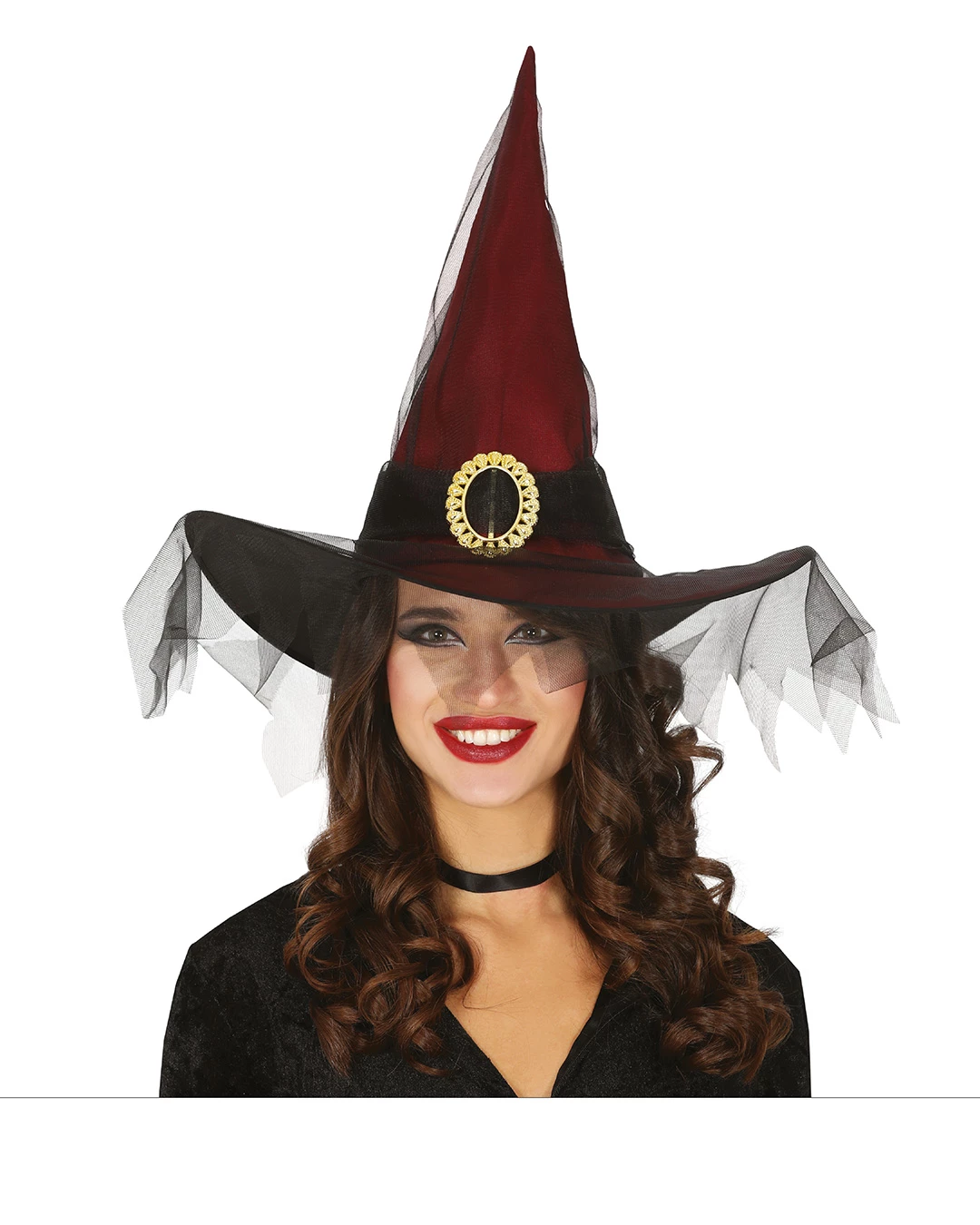 Lieferumfang: 1 x Edler Hexenhut mit goldener Schnalle & Tüll