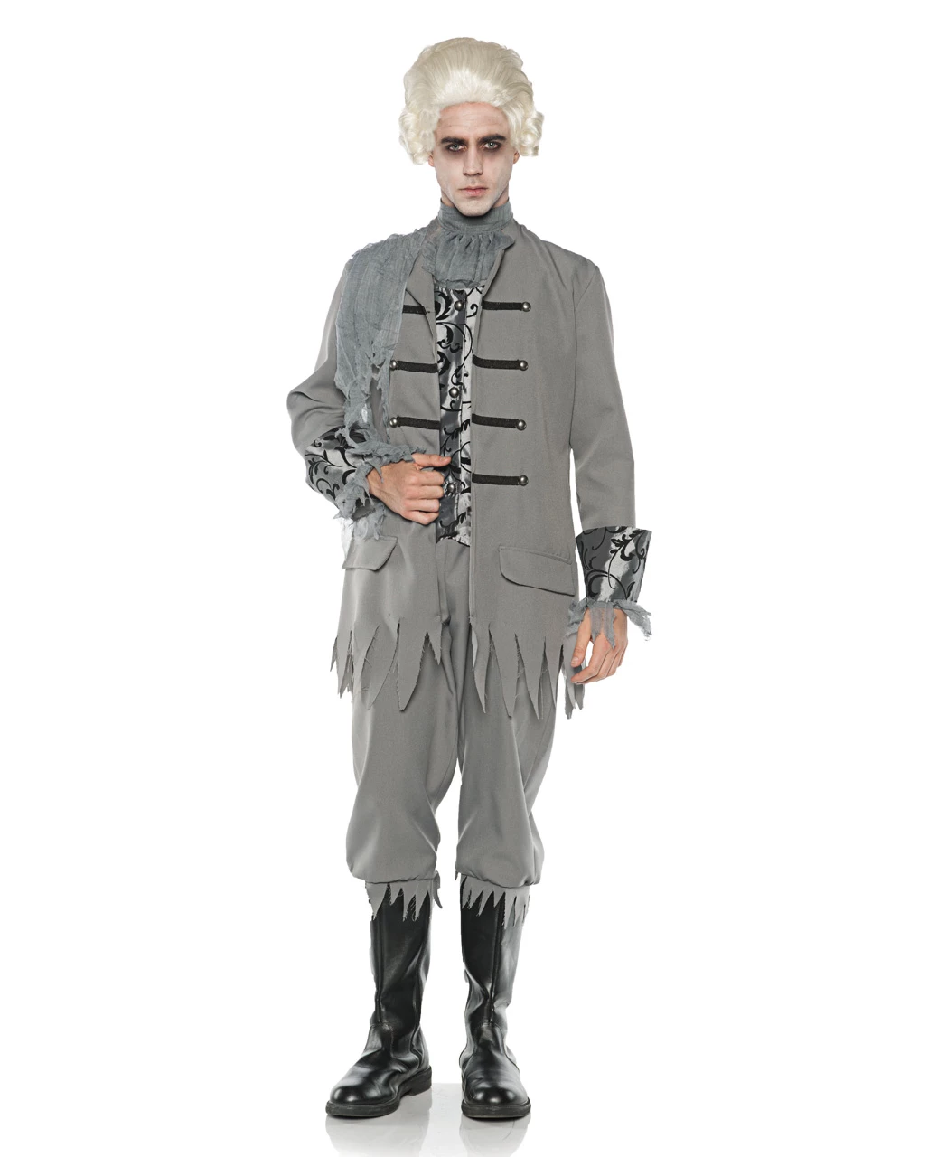 Das Geister Kostüm Edelmann besteht aus Jacke, Hose und Jabot. Schnitt und Stil der Halloween-Verkleidung sind den Bekleidungen der Adligen der Renaissance nachemfunden: Eine schneidige, an eine Uniform erinnernde Kostümjacke mit zwei doppelreihigen Knopfleisten und angenähter silberner Weste geht über in ein graues Beinkleid. Das Jabot unterstreicht den noblen Stil der Geisterbaron-Verkleidung. Mehrere gezackte Risse an den Säumen des Halloween-Kostüms sorgen für einen abgetragenen, eines adligen Gespenstes würdigen Look. Dazu passen die Rokoko Herren-Perücke mit Zopf und das Gespenster Make-up Set 7-teilig.