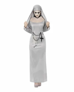 Das zweiteilige Geister Nonne Kostüm besteht aus der klassischen Nonnenrobe und der passenden Kopfbedeckung. Diese ist eine Schwesternhaube und wird wie ein Haarband aufgesetzt, der Schleier fällt dann über das Haar. Die Robe selbst ist mit langen Trompetenärmeln versehen und besteht aus weichem, grauem Stoff, der angenehm zu tragen ist. Ein taillierter Schnitt und graue Spitze am Dekolletée verleihen dem Geister Nonne Kostüm etwas extravagantes. Abgerundet wird das Klostergewand durch einen grauen Stoffgürtel mit angebrachtem schwarzen Rosenkranz mit Filzkreuz. Dieser gibt dem Nonnenkostüm zusammen mit dem schwarzen Kragen ein wenig Kontrast. Geschlossen wird das Klosterkostüm mit Klettverschluss am oberen Rücken. Passend zur Nonnenrobe empfehlen wir das Grufti Schmik Set.