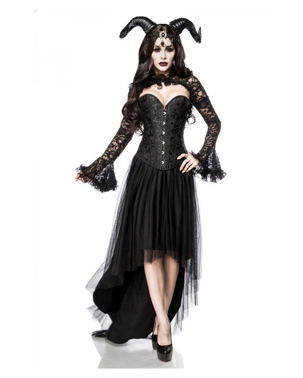 Dieses edel anmutende Halloween Gothic Kostüm für Damen fasziniert nicht nur die Trägerin! Wenn du dein schwarzes Gothic Kostümkleid für Halloween trägst, sind dir die Blicke der Partygäste sicher. Diese düstere Gothic Verkleidung mit Hörnern macht aus dir eine echte Dämonin, die nur darauf wartet ihre Opfer zu betören und in die Unterwelt zu ziehen. Im Lieferumfang enthalten ist ein sexy Spitzen-Bolero, eine Corsage mit herzförmigem Ausschnitt und natürlich der edle Rock, welcher im Vokuhila-Stil geschnitten ist. Dämonen Hörner und eine Kette bilden deinen Kopfschmuck und runden das Outfit perfekt ab. Hol dir dieses einzigartige Gothic Dämon Damenkostüm mit Hörner und lege einen unvergesslichen Auftritt hin! Das beste: Dieses XL Gothic Kostüm passt auch kurvigen Ladys!