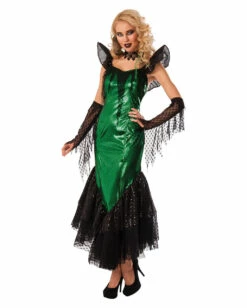 Das Gothic Kostüm Meerjungfrau besteht aus einem knöchellangen Kleid, zwei Handschuhen, einem Kropfband und einer Haarklammer. Das Kleid des Märchen-Kostüms ist in einem dunklen Grünton gehalten mit zahlreichen stilisierten Schuppen. Der schwarze Tüll am unteren Ende des Nymphen-Kleides ist so geschickt angeordnet, dass der typische Schwanzflossen-Look entsteht. Mit zwei seitlich angenähten Bändern kannst du dein Sirenen-Kleid noch taillierter schnüren. Feine, spitzenbesetzte lange Handschuhe mit abstehenden Elementen wie bei Fischflossen unterstützen den geheimnisvollen Meeresbewohner-Anblick zusätzlich. Das schwarze Kropfband weist vorne eine silberne Blume mit Rubin als Blüte auf und wird mittels Karabiner im Nacken geschlossen. Abgerundet wird die sexy Faschings-Verkleidung durch den Haarschmuck, schwarzen und grünen Bändern in Netzoptik, die mittels Klammer unkompliziert ins Haar gesteckt werden. Zahlreiche glänzende Pailletten schmücken das Nixen-Kostüm und erwecken den Eindruck von vielen kleinen Wassertropfen. Dazu passen die Siren Langhaar Perücke schwarz und Schwarzer Nagellack & Lippenstift.