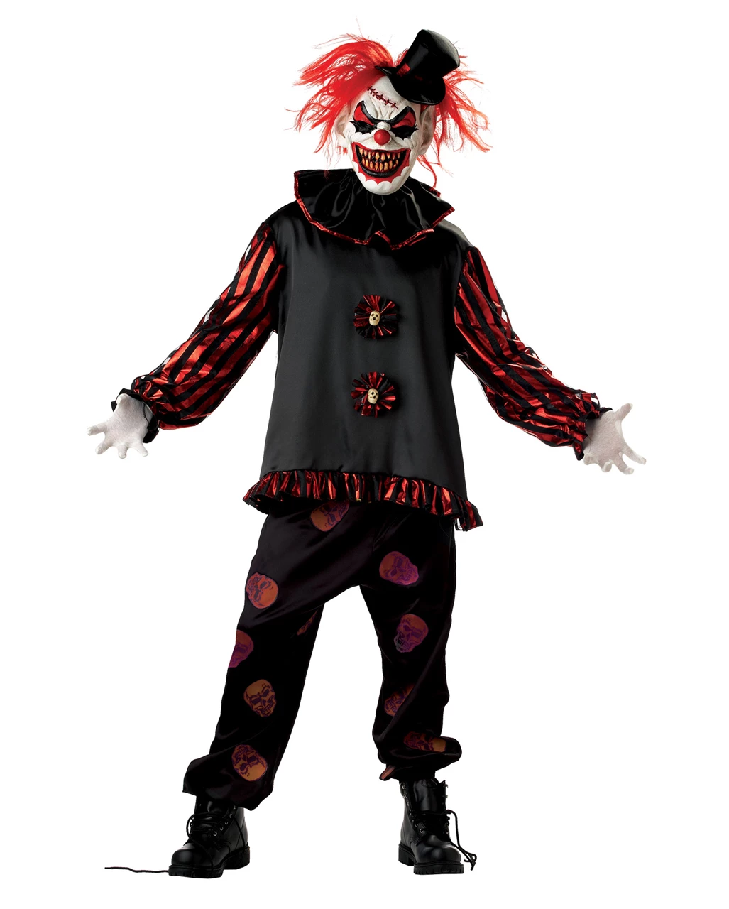 Das coole Halloween Kostem des Horror Clowns ist komplett mit Kostüm und Clownsmaske ausgestattet. Die Clownmaske besitzt feuerrote Haare und einen kleinen schwarzen Zylinder als Hingucker.. Die teuflisch grinsende Clownsmaske besitzt auf der Rückseite unter den Haaren ein Gummiband, das die Maske am Kopf hält. Das Horror Clown Kostüm selbst besteht aus schwarzem langärmlingen Hemd mit Rüschen, Kragenkrause und der schwarzen mit Screenprint bedruckten Hose. Mit dem Clowns Kostüm bist Du garantiert eine der unheimlichsten Gestalten die an Halloween die Strassen unsicher machen!