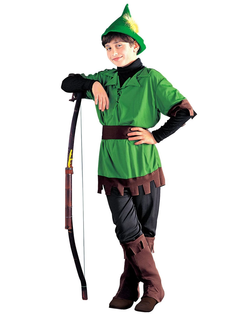 Das Helden Kostüm Set besteht aus einer schwarzen Hose, einem grün, braunen Shirt mit Sägezahn Säumen, passenden brauenen Stiefelstulpen, einem grünen Spitzhut mit einer gelben Feder und einem braunen Gürtel. Mit diesem Räuber Outfit bist du der Held auf jedem Kinderfasching, Halloween oder Motto Event, aber auch für Theateraufführungen und Fotoshootings auf dem nächsten Kindergeburtstag bist du der Hingucker. Du kannst dein neues Räuberkostüm auch mit Pfeil und Bogen Set und Höhlenmensch Keule oder Schwarze Zorro Maske noch zusätzlich aufpeppen.