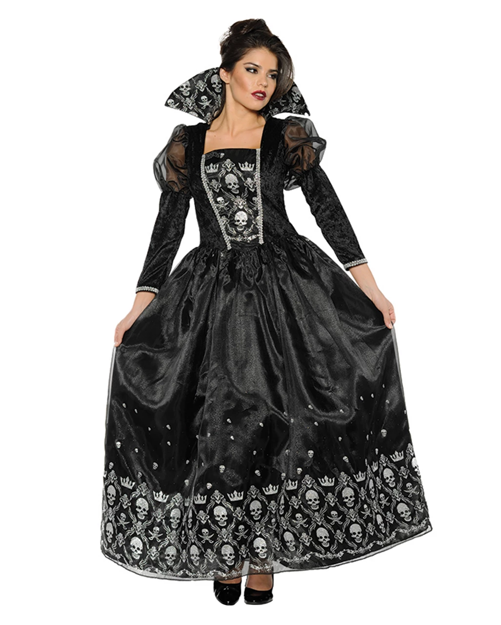 Das Kostüm Dunkle Königin besticht durch seine schöne Optik. Das bodenlange, schwarze Kleid mit angedeuteter Corsage verleiht dir einen geheimnisvollen, düsteren Touch. Verzierungen in Form von Totenschädeln, manche davon mit gekreuzten Säbeln anstelle von Knochen, schmücken das elegante Herrscherin-Kostüm an Kragen, Saum und Rock. Stilisierte Kronen geben dich deutlich als Regentin zu erkennen. Die zahllosen glitzernden Pailletten der sexy Halloween-Verkleidung lassen dich funkeln und machen dich zum absoluten Blickfang! Dazu empfehlen wir die Schwarze Gothic Halskette und die Evil Queen Krone schwarz/Glitter.