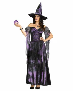 Das Kostüm Starlight Hexe besteht aus Kleid und Hut. Das Kleid der Fastnacht-Verkleidung besticht mit seinen düsteren Lila- und Schwarztönen. Zahlreiche stilisierte Fetzen an den Ärmeln und am Saum sorgen zusätzlich für eine finstere Optik als geheimnisvolle Magierin. Die angedeutete Schnürung verleiht dem Faschings-Kleid eine Gothic-Optik und sorgt für einen taillierten Schnitt. Abgerundet wird die Magierin-Verkleidung durch einen charakteristisch spitz zulaufenden Hexenhut, ebenfalls in Lila und Schwarz gehalten. Dazu passen ein Hexen Make-up Komplett Set und Spitzenhandschuhe ellbogenlang.