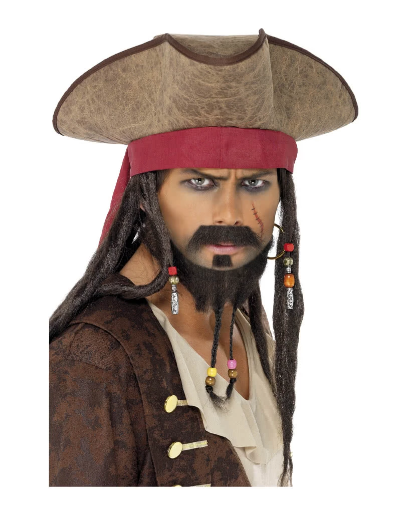 Der braune Piratenhut mit Dreadlock-Haaren hat die klassische dreieckige Form und ein rotes Bandana. Die langen schwarzen Haare und Dreadlocks sind direkt an dem Hut festgenäht und werden noch von zwei rot-orangen Perlenzöpfe aus Holzperlen und silbernen Schmuckperlen geschmückt. Deinen Look als Piratenkapitän rundest du mit dem Freibeuter-Bart Set ab.