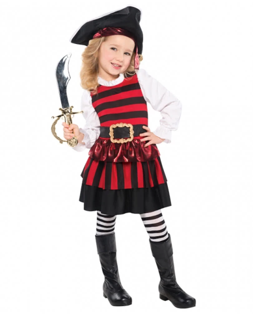 Das Piratenmädchen Kostüm überzeugt durch viel Detailliebe und ein schnuckeliges Design. Die Verkleidung besteht aus drei Teilen: Den üblichen Piraten-Dreispitz, gesäumt mit einer funkelnden, roten Schleife. Die Verkleidung selbst im schwarz-rotem Muster, mit integrierten Gürtel, Unterrock und weissen Ärmel mit Rüschen. Abgerundet wird die Piraten Verkleidung für Mädchen durch eine schwarz-weiss gestaltete Strumpfhose. Um die Verkleidung zu erweitern, empfehlen wir den 20026 und die 19561 für das perfekte Seeräuber-Outfit!