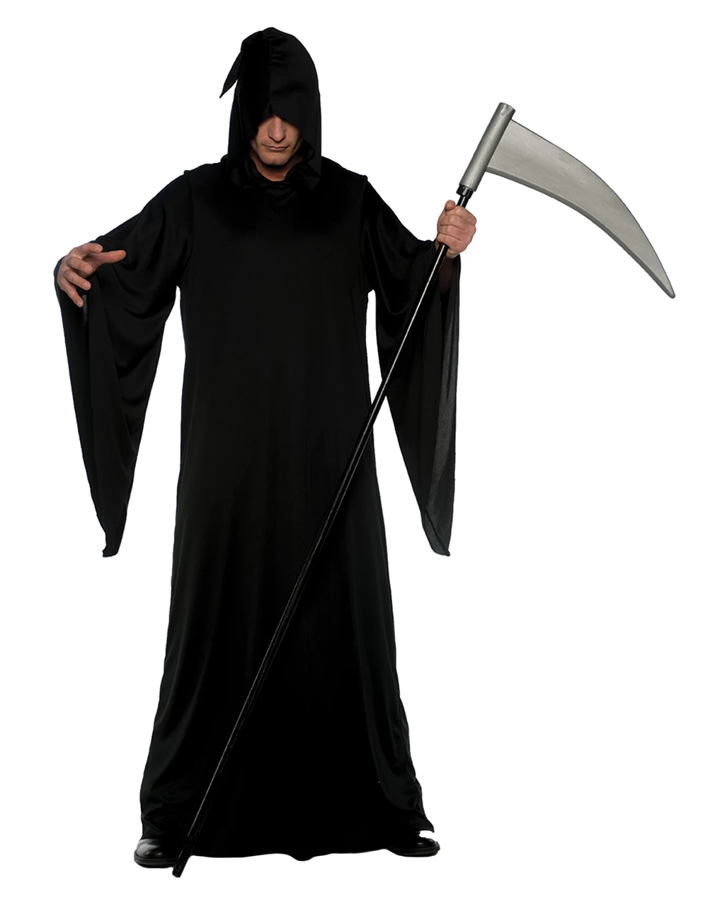 Verkörpere mit unserem schwarzen Sensenmann Kostüm den fleischgewordenen Tod! Durchtrenne verkleidet als finsterer Schnitter Lebensfäden mit der Sense und jage Freunden und Familie an Halloween und auf Horror Partys eine Heidenangst ein!