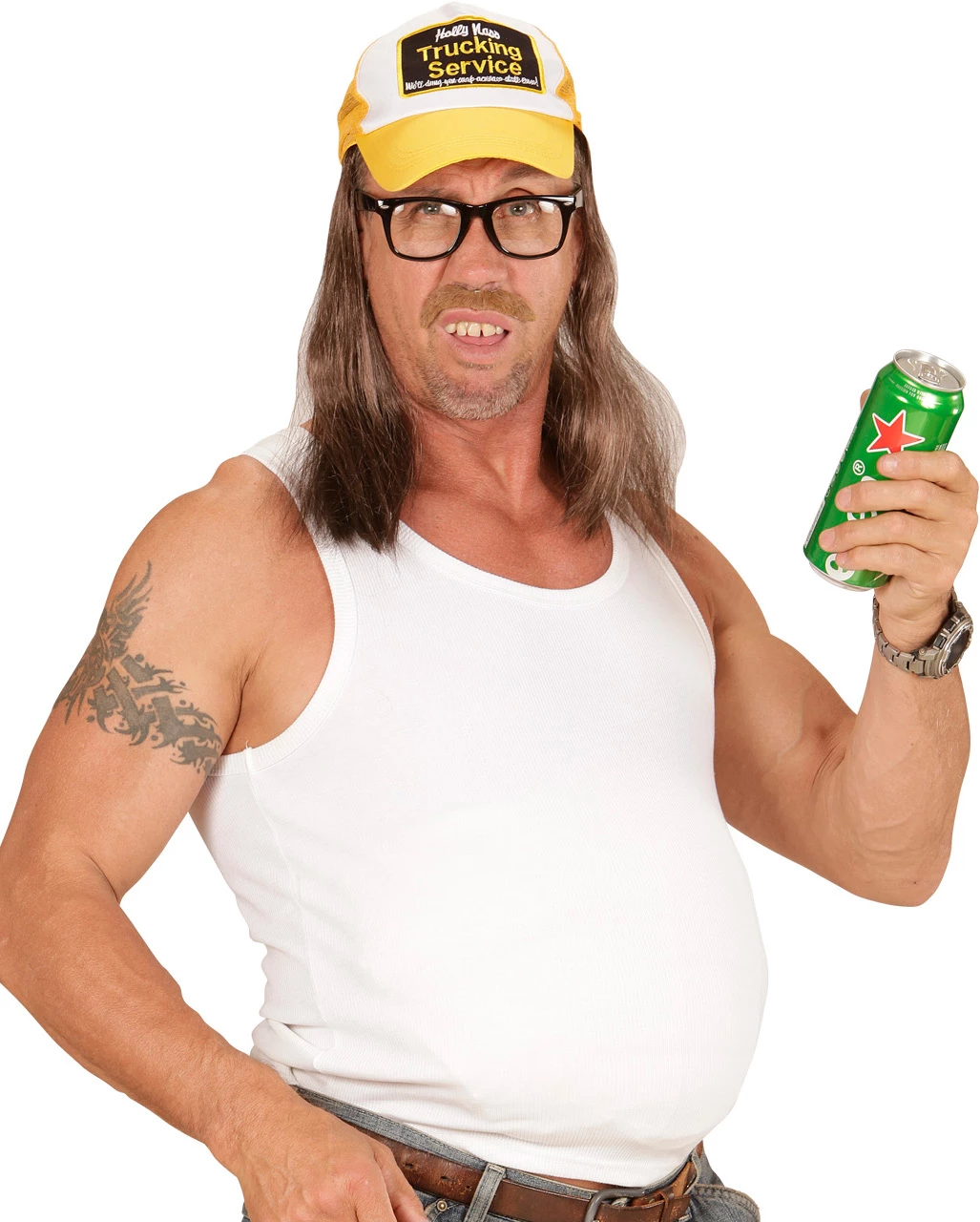 Der gelb-weiße Trucker Hut mit Haaren kommt in Einheitsgröße und hat die Aufschrift „Trucking Service“. Dunkelblondes Kunsthaar ist an dem Trucker Kostümzubehör befestigt und sieht super trashy aus. Die Trucker Kappe mit Haaren ist eine fixe Verkleidung für Karneval & Mottoparty und lässt dich als protziger Fernfahrer in Erscheinung treten. Du möchtest dem Klischee so richtig entsprechen? Trage dazu unser Gammelzähne Scherzgebiss 6 St. und fertig ist dein Trucker-Look!