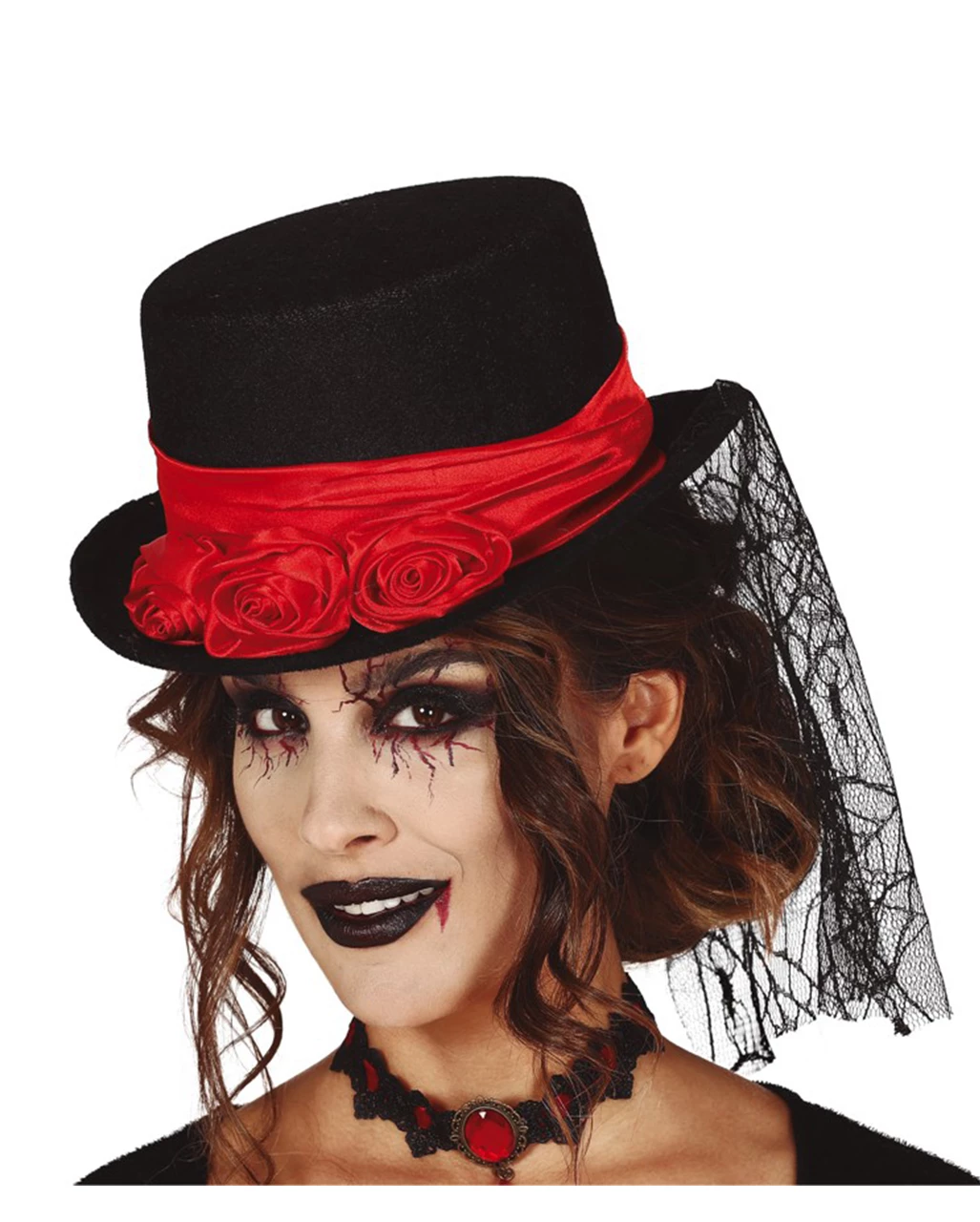 Die hübsche Vampir-Dame verlässt ihre Gruft niemals ungestylet. Dazu gehört neben dem perfekten Kleid, auch der passende Kopfschmuck für Halloween. Dieser elegante Vampir Zylinder mit Rosen & Schleier ist ein edler Blickfang, der zu romantisch-düsteren Halloweenkostümen passt. Als Vampirin Hut oder Tag der Toten Zylinder für Damen macht sich unser Kostüm-Accessoire mit Rosen ganz hervorragend. Der schwarze Spitzenschleier veredelt den Look.