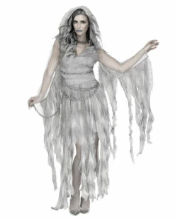 Das verzauberte Geisterbraut Damenkostüm ist in den Größen S/M und M/L erhältlich. Es besteht aus weichem, leicht transparentem Stoff. Der graue Fetzenumhang erinnert an ein zerrissenes Brautkleid. Eine befestigte Kette sowie Spinnweben Applikationen sorgen für einen tollen Blickfang. Das Halloween Brautkleid für Damen hat außerdem eine Kapuze. Die passende Perücke kannst du dir mit Todesfürstin Lockenperücke grau dazu kaufen um den Look perfekt zu machen.