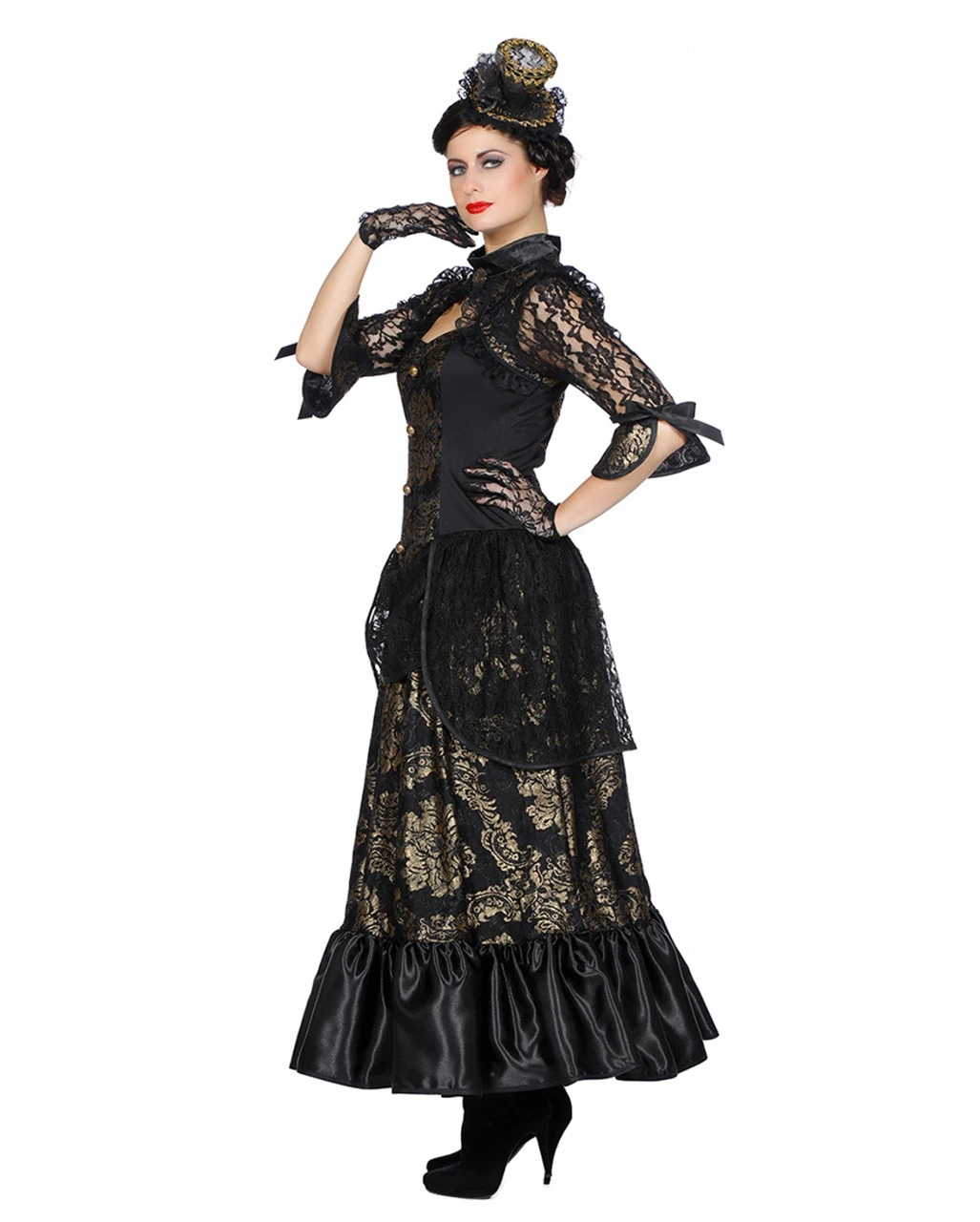Das Viktorianische Lady Kostüm ist ein schwarzes Spitzenkleid bis Größe 48. Die Damen Verkleidung passt zu Mottofeten, Gothic-Events & Halloween. Das lange Damen Kostümkleid kommt mit Spitzenbesatz, Ornamentmusterung und Zierschleifen. Du siehst sofort, dass dieses Gothic Spitzen Kleid mit viel Liebe zum Detail designet wurde. Goldene Zierknöpfe an der Front bilden einen kontrastreichen Blickfang und die Brosche am Halsband sorgt für einen zusätzlichen Hingucker. Den Burlesque Minizylinder schwarz kannst du separat dazu bestellen.